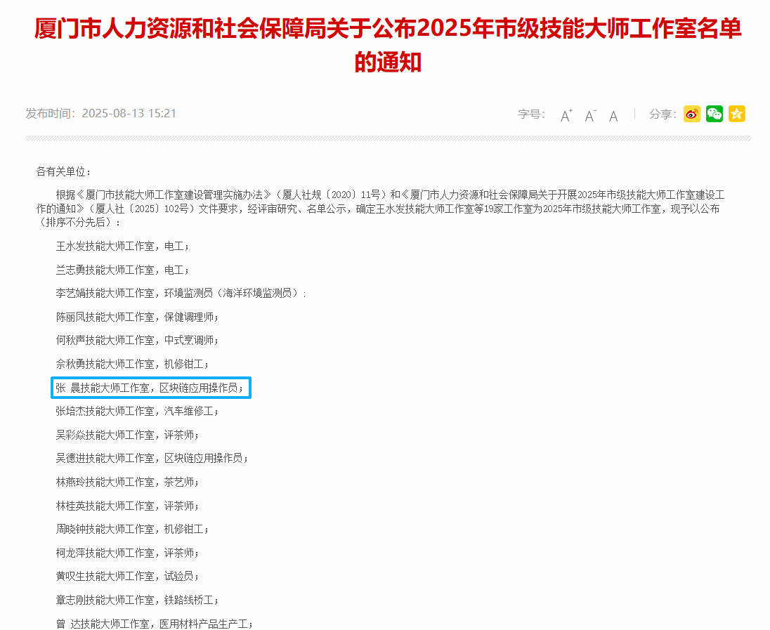 近日,厦门市人力资源和社会保障局公布了2025年厦门市技能大师工作室名单。张晨技能大师工作室成功入选!
