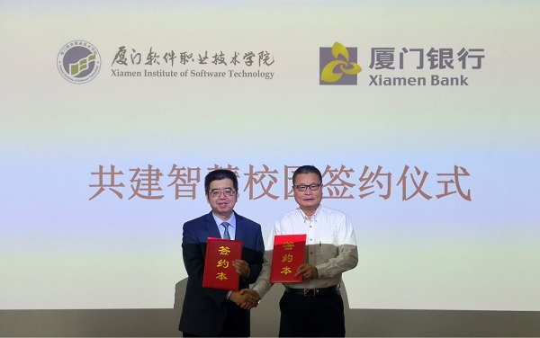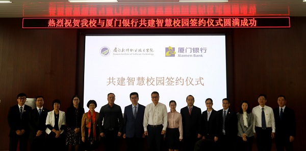 11月19日上午,我校与厦门银行共建智慧校园签约仪式成功举行。厦门银行总行副行长兼厦门业务管理总部总监刘永斌、中国银联厦门分公司市场部副总经理刘龙庭、银联商务厦门分公司副总经理陈玲、我校执行校长郑通涛教授、党委书记蔡良山、副校长王杰华、校长助理庄小兰教授出席了签约仪式。厦门银行、中国银联及银联商务等领导和我校学校中层干部及学生代表参加了此次活动。
