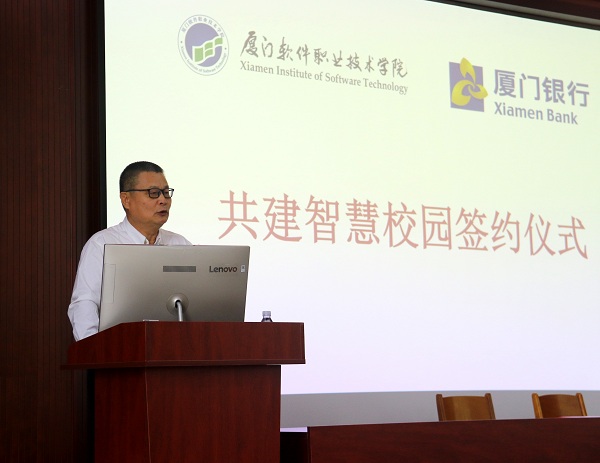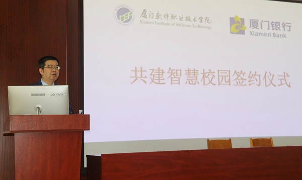 随后,刘永斌副行长高度赞誉了我校的办学思想、办学理念和产教融合取得的成果。他指出,厦门银行为厦门软件职业技术学院提供智慧校园等金融服务,是厦门银行在本地金融领域的又一新的拓展。他希望,未来可以在同软件学院、中国银联等伙伴的合作下,充分发挥银行独特的优势,为学校提供优质、高效的金融服务,全力支持学校打造智慧校园的相关项目,推动高端信息技术更好地服务学校的教学科研、管理服务和体制机制创新,以实现各方的多赢发展。