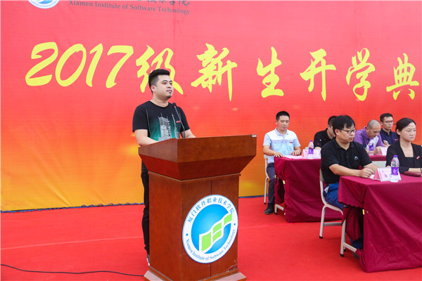 新生代表魏思远同学发言。他表示进入大学生活将是2017级新生成人与成才的第一步,他满怀对大学生活的期待和勤奋求知的决心,承诺将以新时期厦软学子的姿态昂首阔步迈向更灿烂的明天。