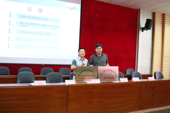 会议首先由聂菁副教授介绍人才培养模式及本次校企合作的主要思路和方向;其次由厦门北星博辉科技有限公司王宁总经理介绍本次校企合作项目具体情况,包括公司业务内容、人才培养目标及未来行业前景等;最后由双方代表签定合作协议书并共同为合作项目揭牌。