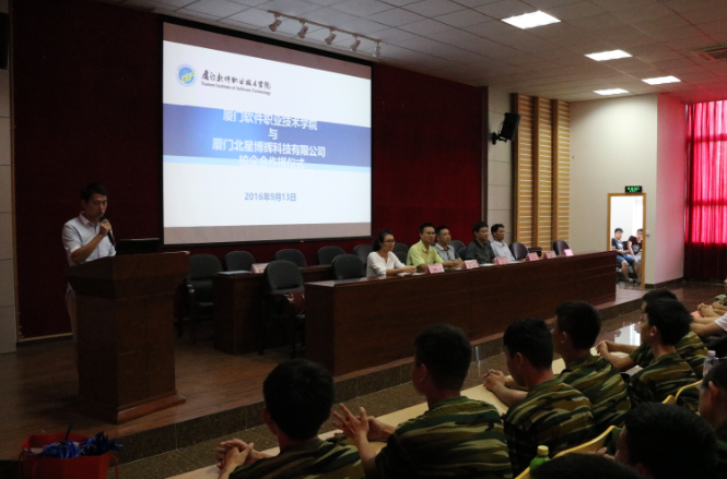 2016年9月13日下午,软件工程系在教学楼F-201举办厦门软件职业技术学院与厦门北星博辉科技有限公司共建校内生产性实训基地揭牌仪式。出席揭牌仪式的有厦门北星博辉科技有限公司总经理王宁、厦门北星博辉科技有限公司人力资源处经理严晓红、学院副院长张念、教务处处长陈建生、软件工程系主任聂菁及师生代表。会议由软件工程系党支部书记钟坚石主持。