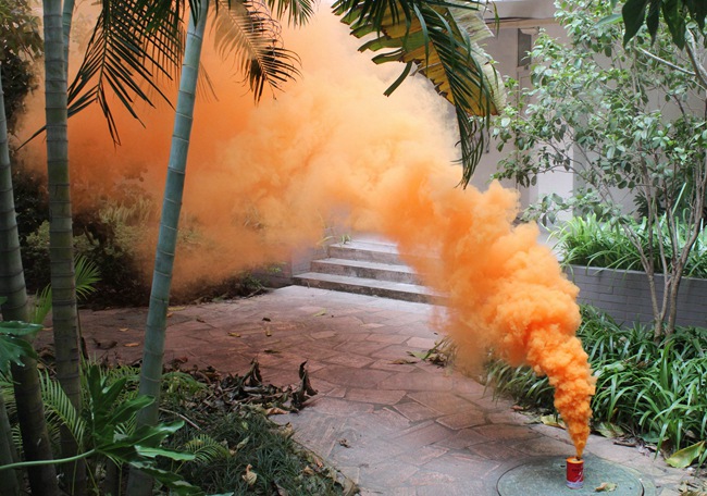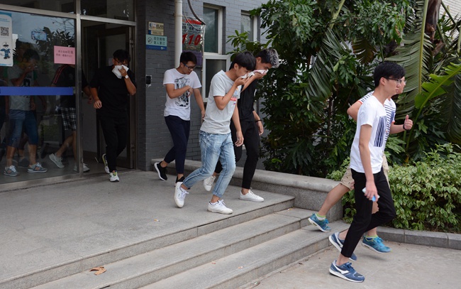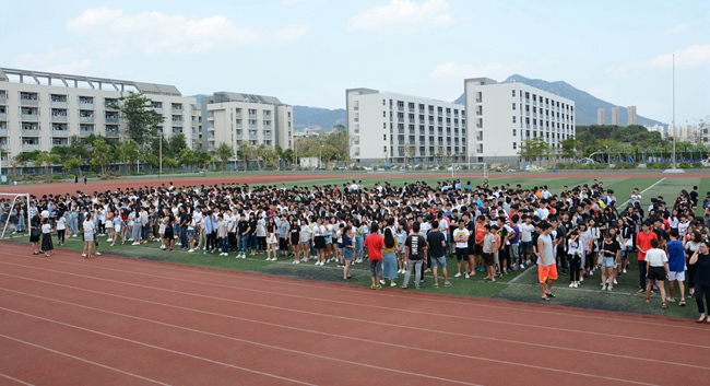 为做好新生入学安全教育工作,进一步提高学生的自救防范能力,9月21日下午,学院在宿舍区开展了一次消防疏散演练。15:00整燃放烟雾弹,15:01分急促的警报声拉响,听到报警声后,同学们在楼层干部的指引下迅速用湿巾捂住口鼻,沿着指定的路线快速有序地弯腰撤离到田径场,随即各班辅导员清点人数,并层层汇报。老师看着学生全部撤离后,才最后撤离宿舍区,跑到操场。15:10警报解除。