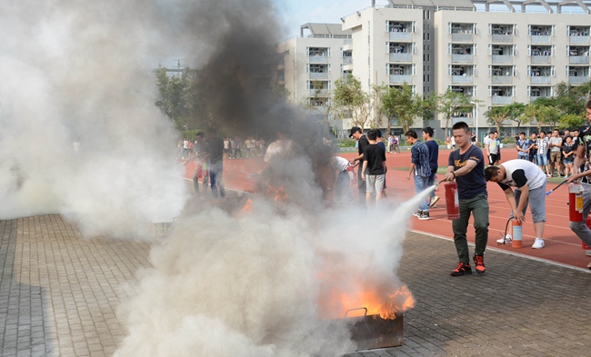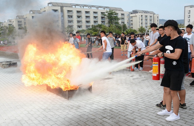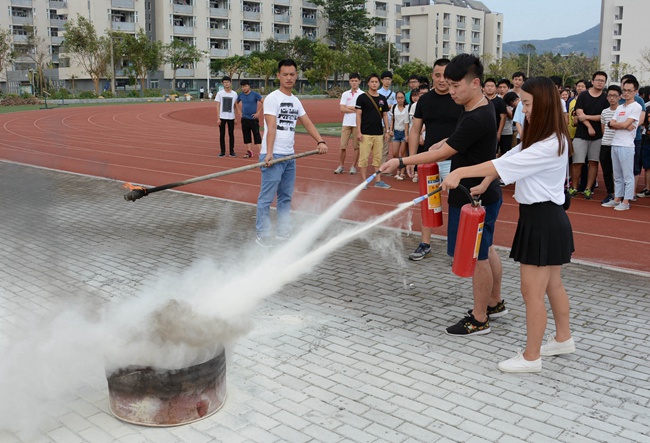 2016级新生疏散完毕后,后勤保卫处陈冬阳老师,对火灾的预防、火场的逃生和自救及消防安全常识进行讲解并对这次疏散演练进行总结。此外还给大家讲解了如何正确使用灭火器,学生有序地进行了灭火练习,取得良好效果。